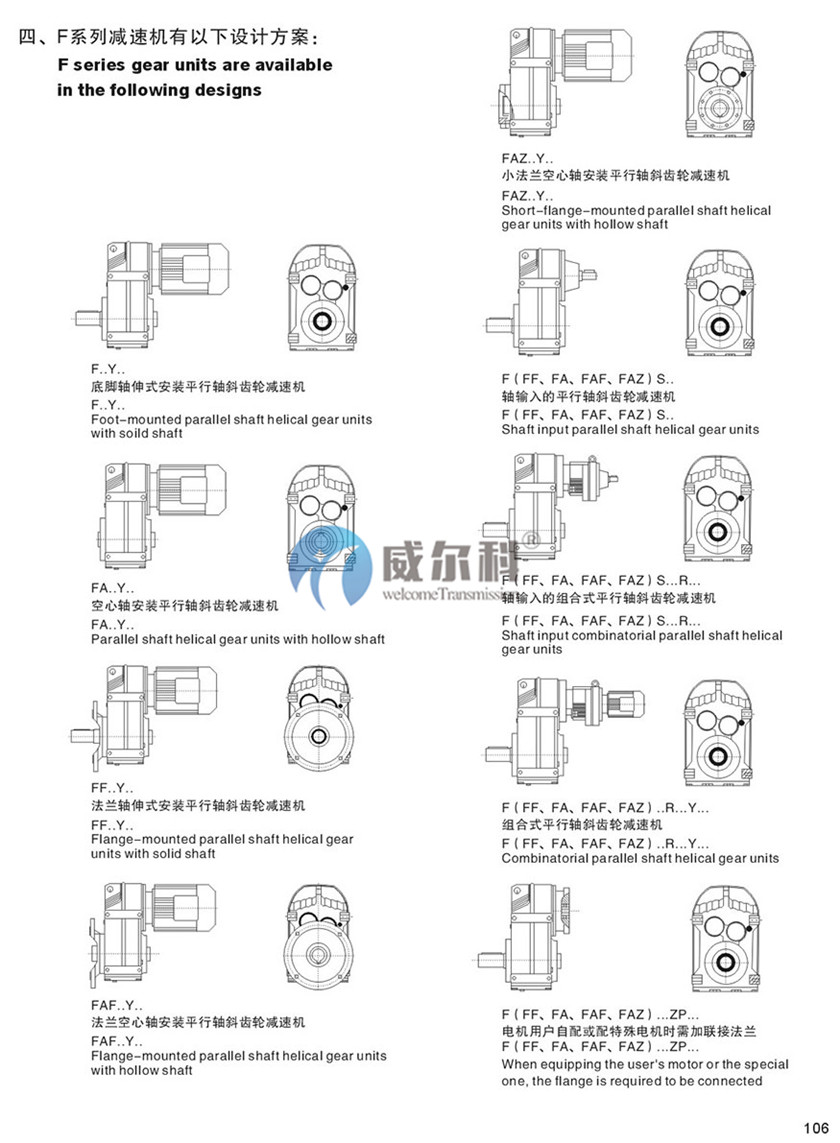 F系列平行軸斜齒輪減速機(jī),結(jié)合國(guó)際技術(shù)要求制造 ,具有很高的科技含量,節(jié)省空間,可靠耐用,承受過載能力高,功率可90KW一上,能耗低,性能優(yōu)越,減速機(jī)效高達(dá)95%以上 ,振動(dòng)小嗓音低,節(jié)能高,選用優(yōu)質(zhì)鍛鋼材料,鋼性鑄鐵箱體,齒輪表面經(jīng)過高頻熱處理,經(jīng)過精密加工, 確保軸平行度和定位的精度,這一切構(gòu)成了齒輪傳動(dòng)總成的減速機(jī)配置了各種類電極,形成了電極一體化,完全保證了產(chǎn)品使用質(zhì)量特性